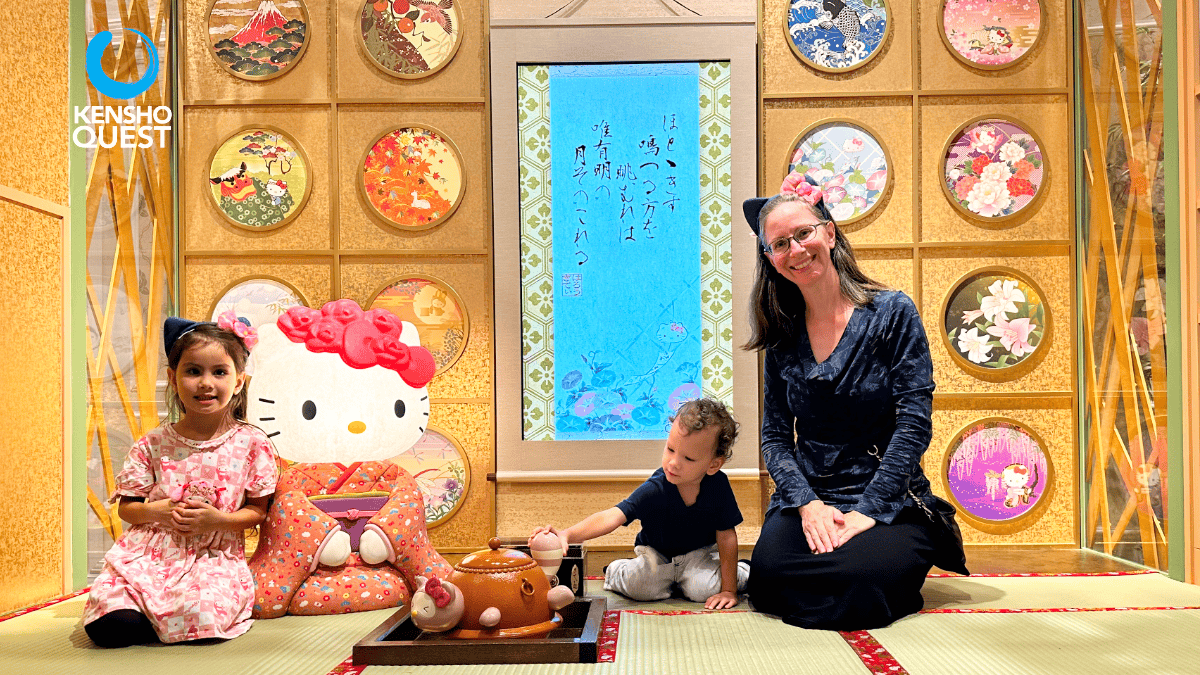 Mom and two kids sitting in a tatami room with Hello Kitty